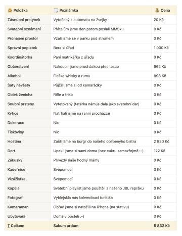 Průměrná cena svatby v Česku (rok 2022) je nějakých 120 tisíc. Lidi si na to buď našetří nebo si berou půjčky. Alternativou je financování od rodičů, případně z obálek od hostů. Ani jedno nám moc smysl nedávalo. Buďto bysme tím zatěžovali sebe nebo někoho, koho máme rádi.